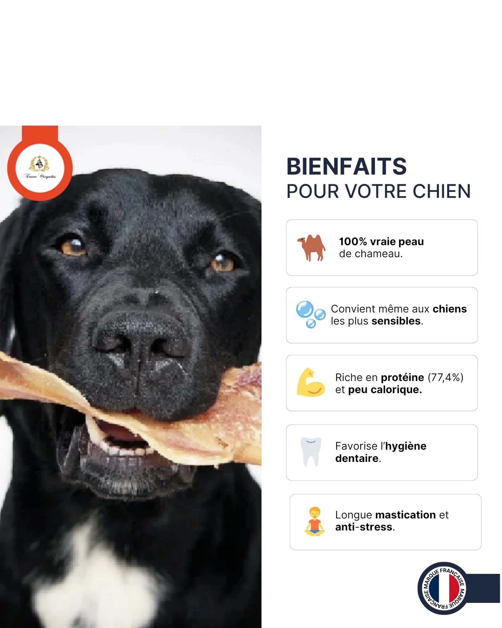 Riche en Nutriments : La peau de chameau est une source naturelle de protéines (77,4%) et de minéraux essentiels, contribuant ainsi à la santé globale de votre chien.