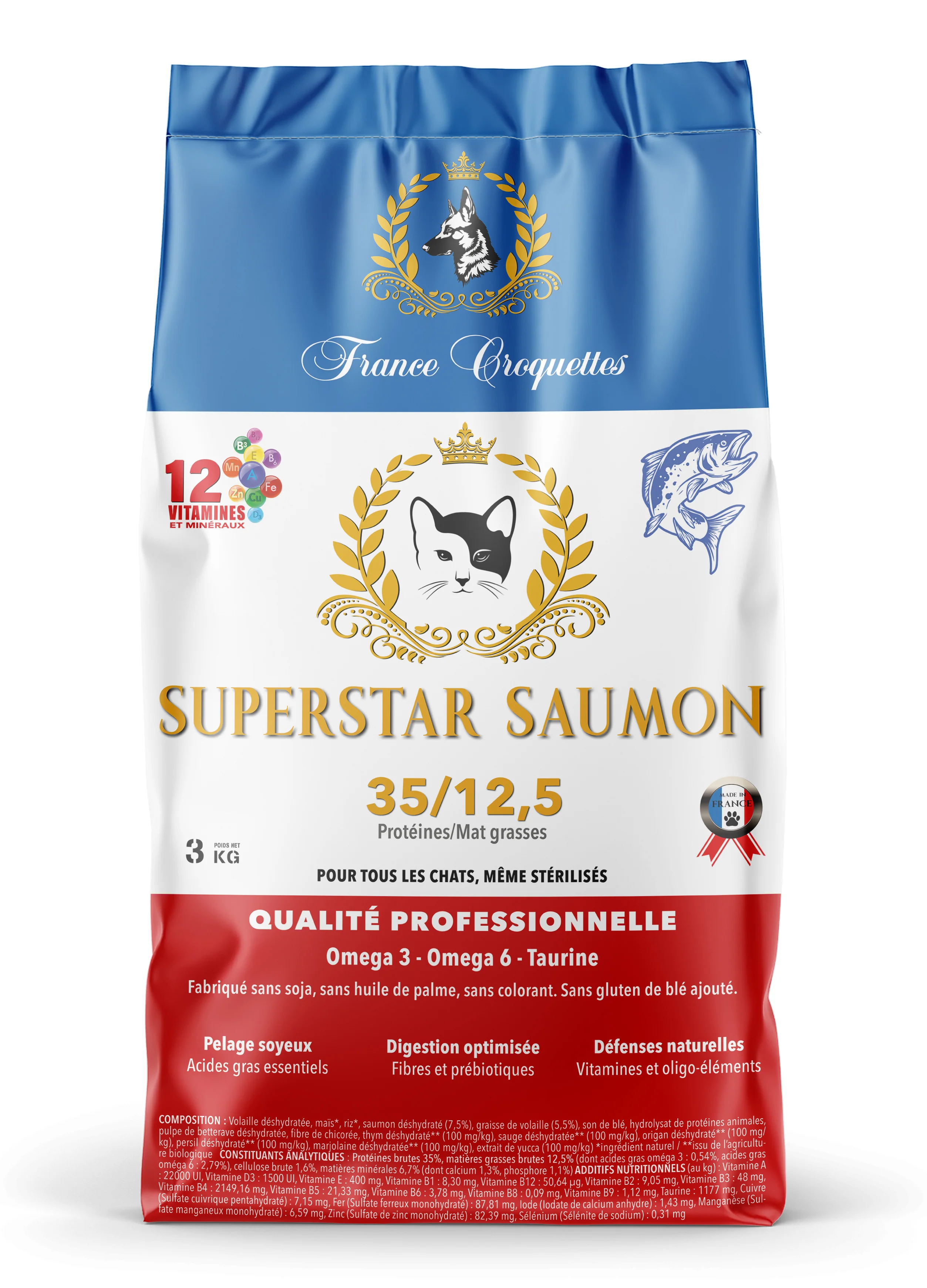 Constituants analytiques : Protéines brutes 35%, matières grasses brutes 12,5% (dont acides gras oméga 3 : 0,54%, acides gras oméga 6 : 2,79%), cellulose brute 1,6%, matières minérales 6,7% (dont calcium 1,3%, phosphore 1,1%)