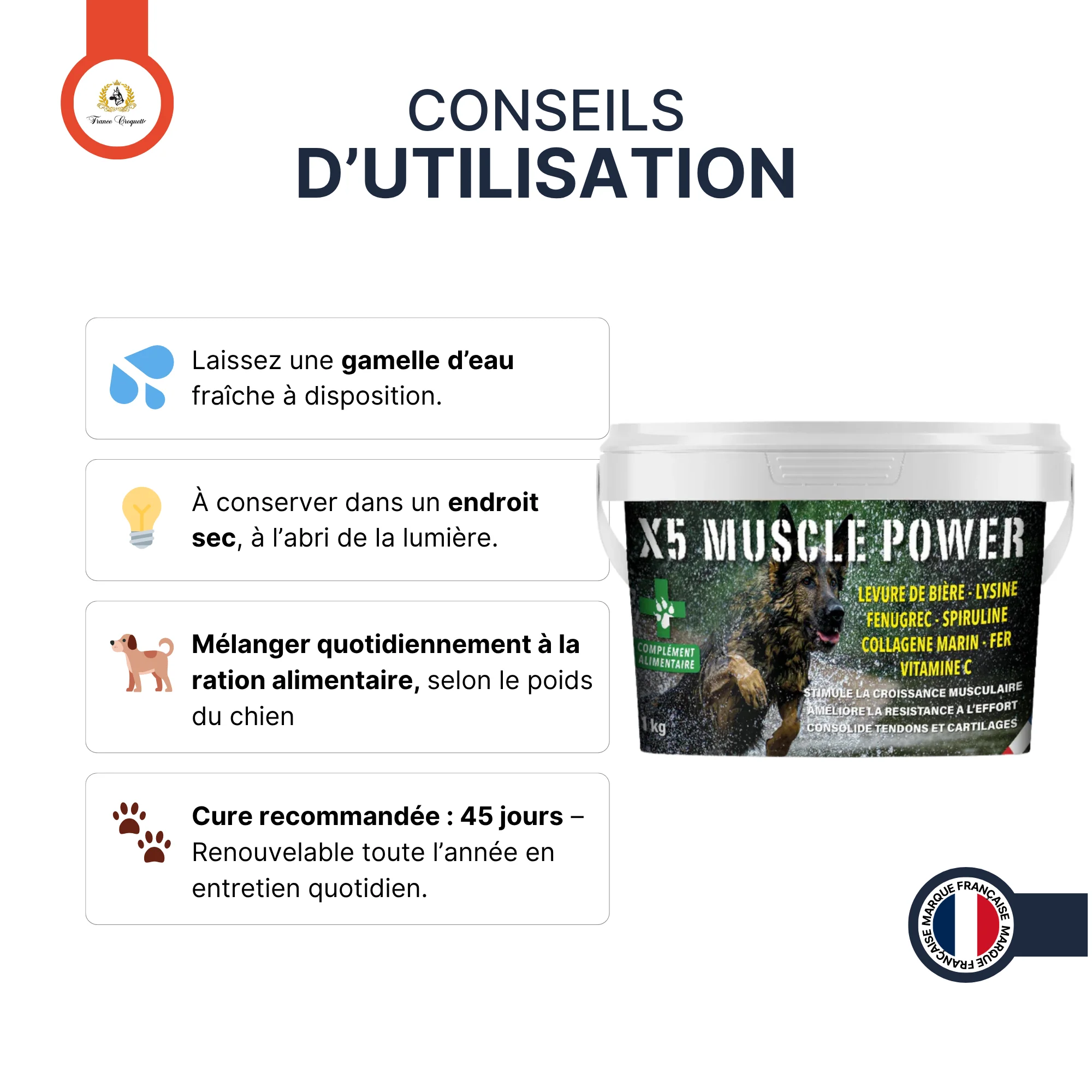 Le complément alimentaire X5 Premium se présente sous forme de poudre et est proposé dans un pot de 500 gr ou 1 kg, accompagné d'une cuillère graduée, il vous suffit de le sous-poudré sur la gamelle (nous vous conseillons de mouiller l'ensemble). Offrant à votre chien les nutriments essentiels dont il a besoin pour maintenir une condition physique optimale.