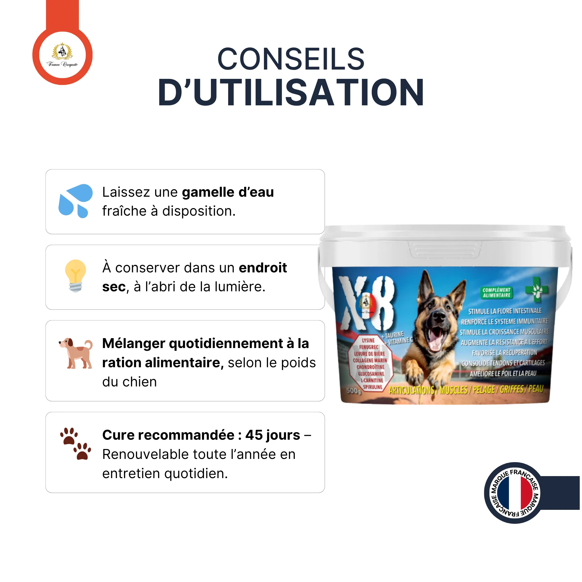 X8, conçu avec soin et élaboré en France 🇫🇷, est le choix idéal pour une vie en pleine forme et en toute sérénité pour votre chien. 🐾💖